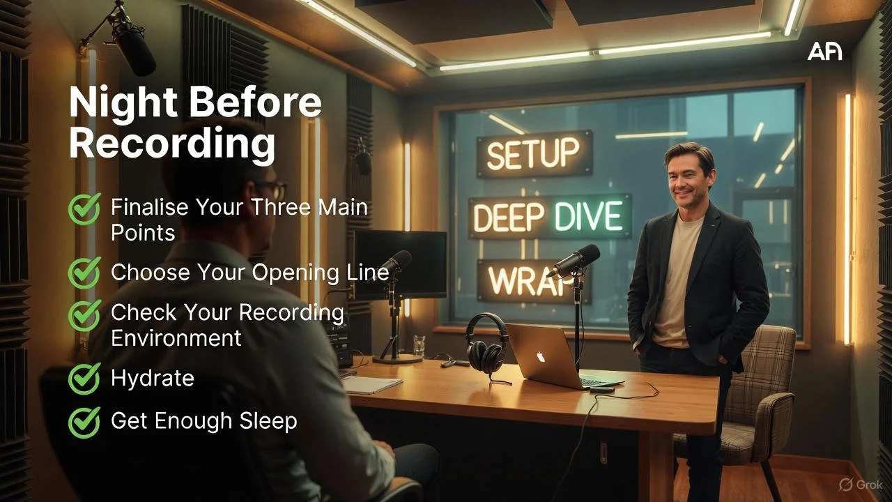 Here’s a concise, practical checklist for the night before your first recording, useful for both new and experienced hosts.