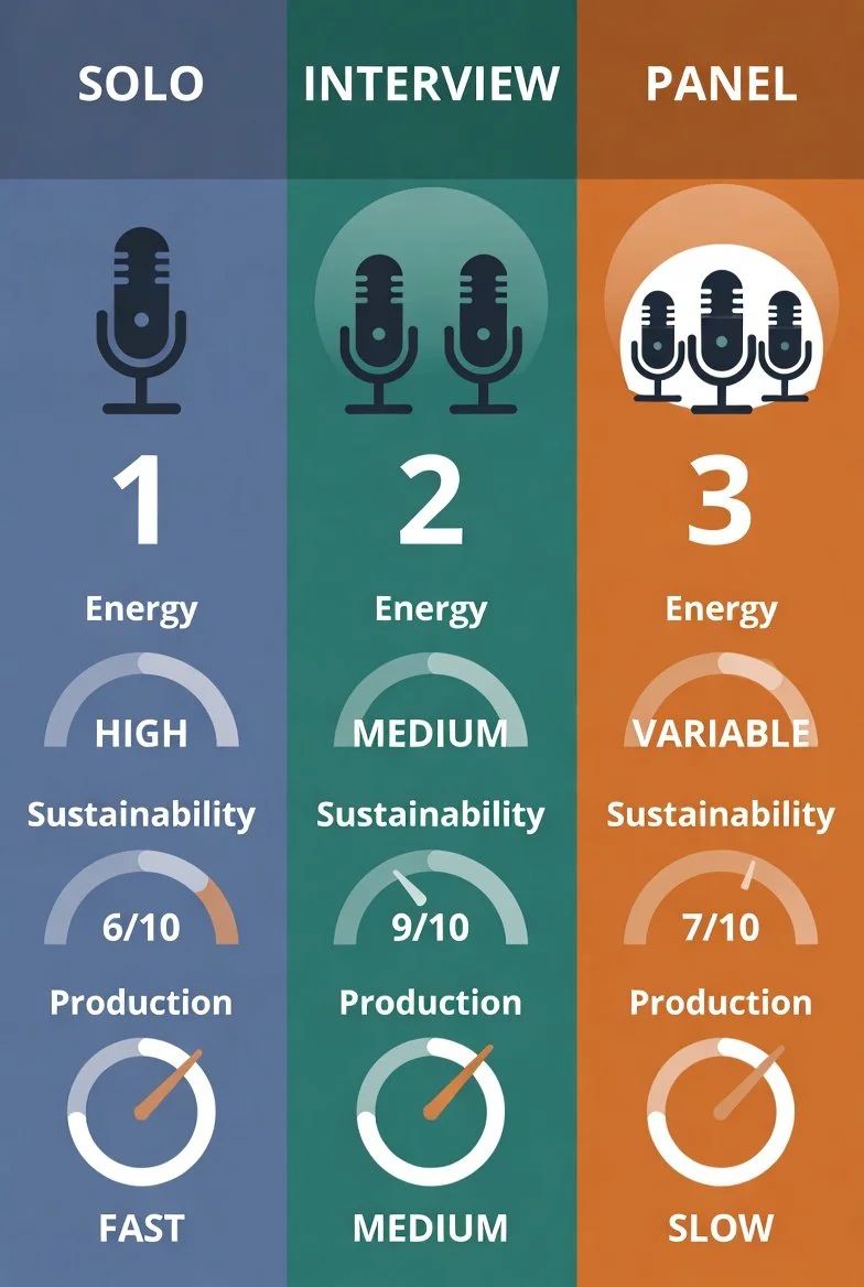 Most podcasters choose their format based on what sounds fun. Then reality hits. Solo requires energy they don't have. Interviews require coordination they can't maintain. Panels require commitment from people who disappear.